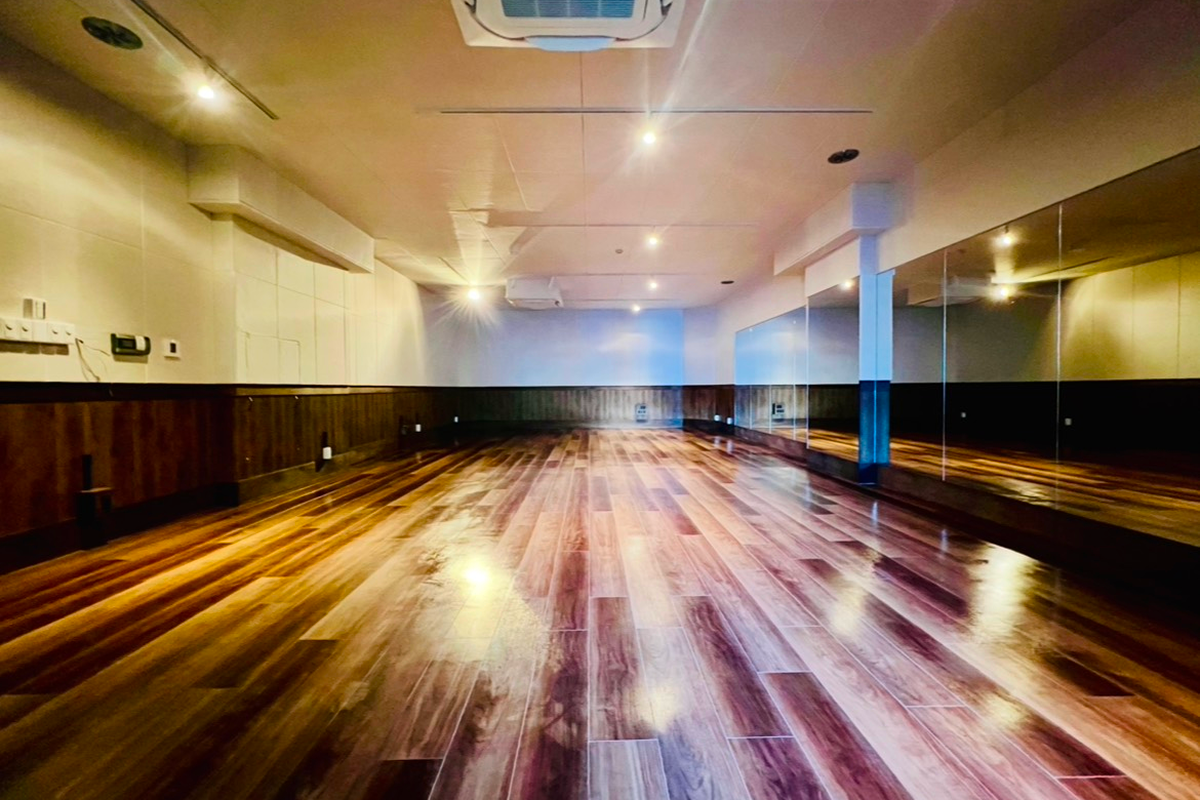 LGS構造をベースに、浮天井(2層・防振金具使用)・湿式浮床・三重浮壁を採用し、遮音・防振性を最大限に強化しました。鉄製防音ドアやインプラスによって開口部からの音漏れも徹底的に遮断。さらに大型ミラーの設置と映像調整対応を行い、音楽だけでなくダンスや映像制作にも対応可能な、多目的スタジオへと仕上げています。